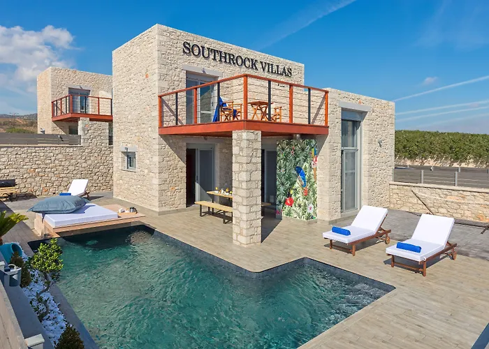 Met een zwembad, een massagekamer, nodigt de gesitueerde in Lachaniá Southrock Villas Lachaniá gasten uit om te genieten van Lachania Beach, gelegen op 11 minuten wandelen ervandaan. Deze 8-kamer villa ligt binnen 7 km afstand van de Agios Anastasia tis Romanou kerk en biedt draadloos internet en privé-autoparkeren.